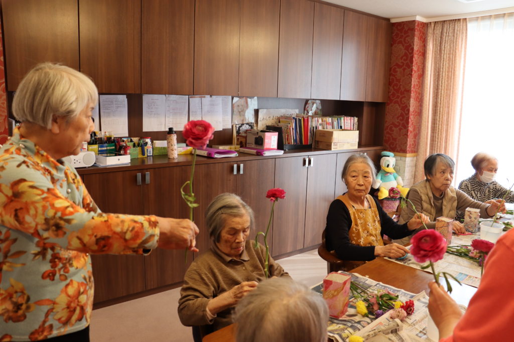 3月の生け花教室を開催致しました。今月の花材は、ラナンキュラス、スターチス、クリスマスローズ、ブルビネラ、スカビオサが近所のお花屋さんから届きました。その中には初めて聞く花の名前がありました。皆様は生け花教室を楽しみにされています。フジ3では入居者が先生を務めて下さいます。お花の説明を聞きながら皆様は真剣です。完成したお花はそれぞれの居室に飾りました。グループホーム フジは、春満開です。