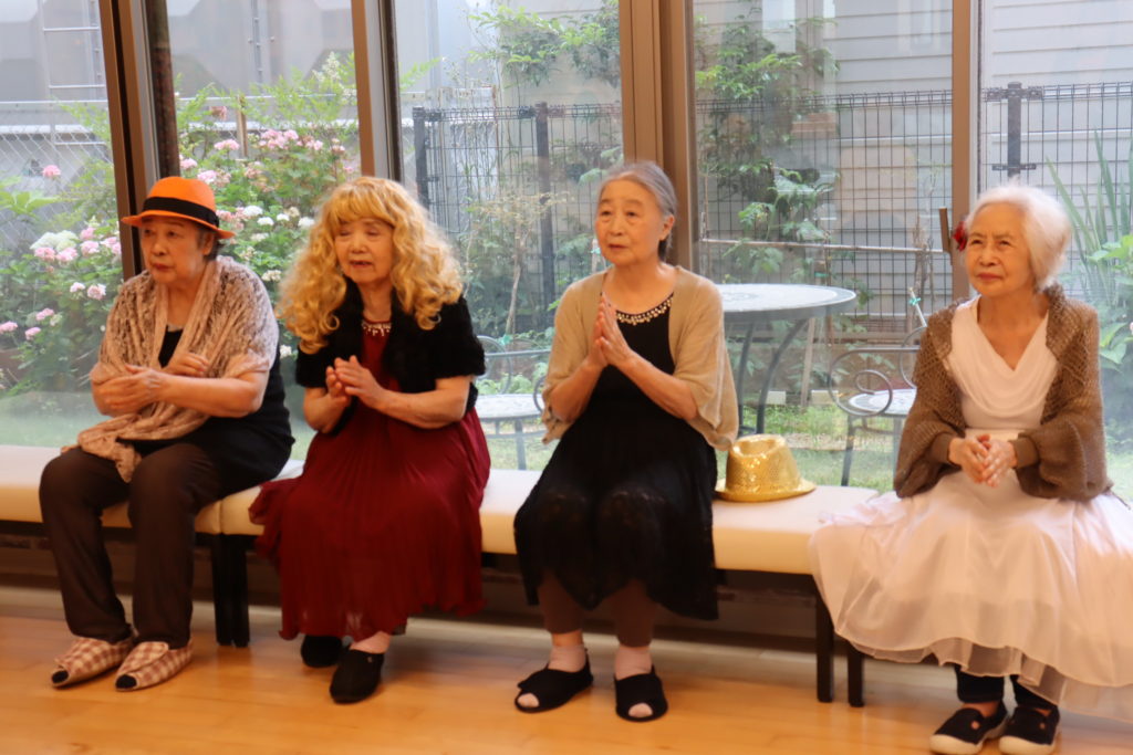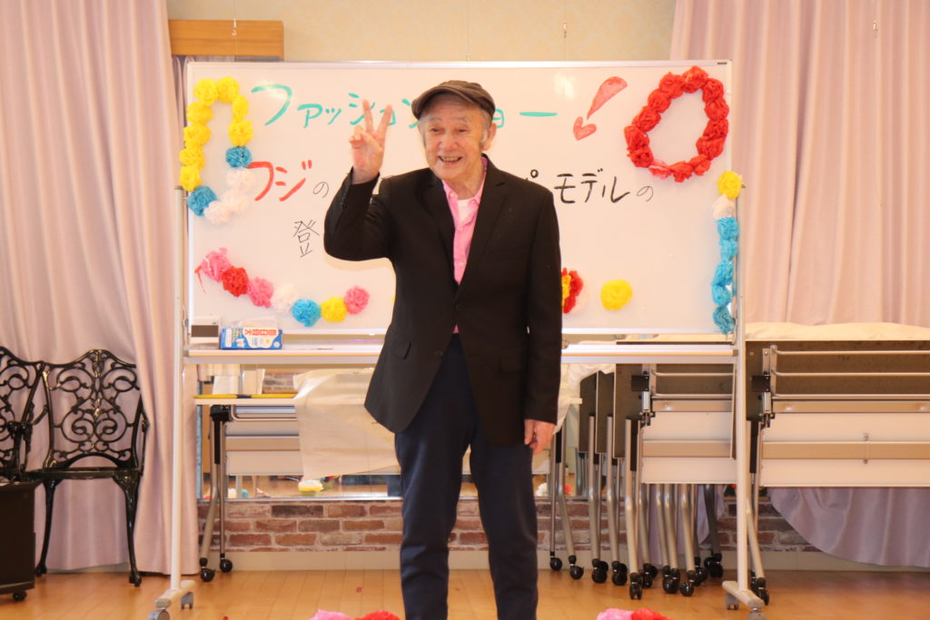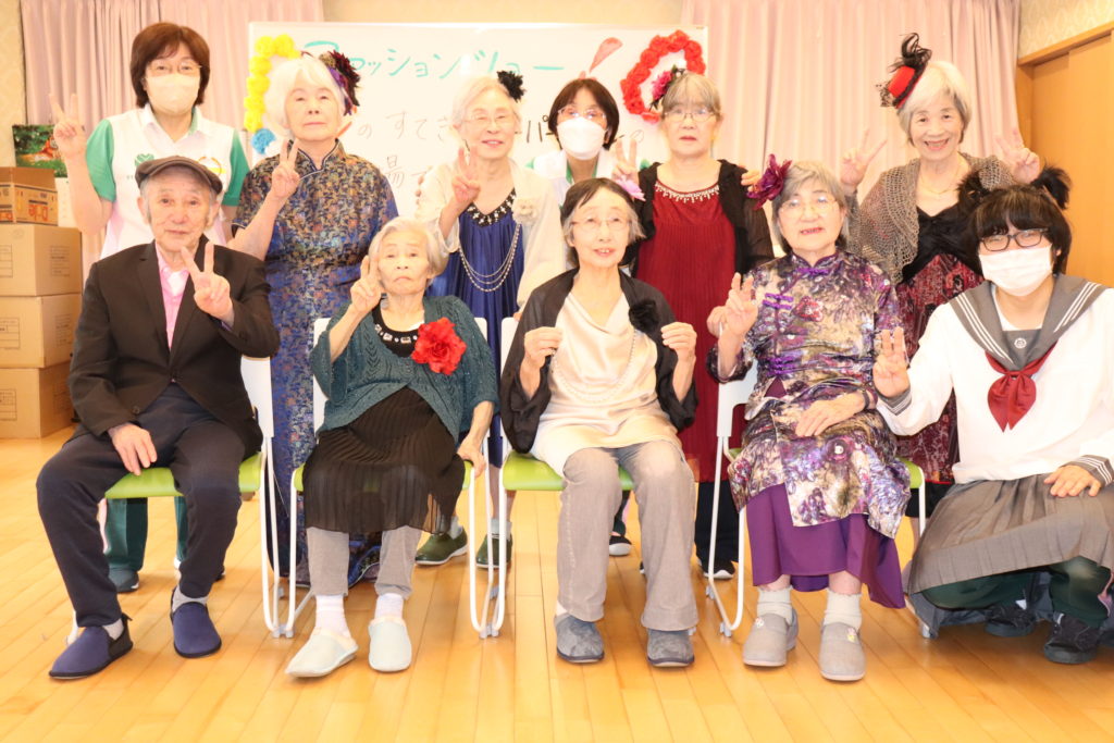 毎年恒例のファッションショーを開催致しました。ファッションショーの本番に向け、ドレス、カツラ、帽子、宝石等、綺麗な物を沢山用意しました。ランウエイには手作りのお花を飾りました。時間になると皆様はお化粧とお好きなドレス、そしてキラキラの小物で変身です。会場では流れる音楽に乗り、歓声と拍手の中、ランウェイを歩かれポーズを決められました。素敵なスーパーモデルの誕生です。 (フジ白井)