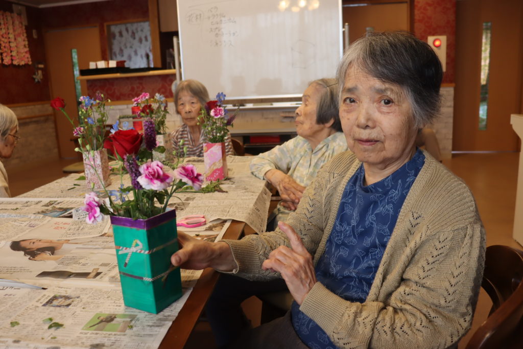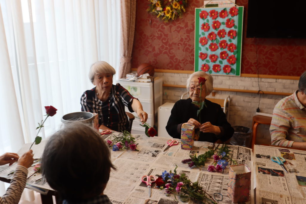 生け花教室を開催致しました。地域のお花屋さんが花材を届けて下さいました。今日は、バラ、テラクリムヒルカニカム、スプレーカーネーション、シネンシスでした。初めて見るお花があり嬉しいです。リビングから「バラを中心にして活けて下さい。」と声が聞こえてきました。入居者様で生け花の得意な方が先生として活躍されています。素敵な作品が出来ました。お部屋に飾ります。