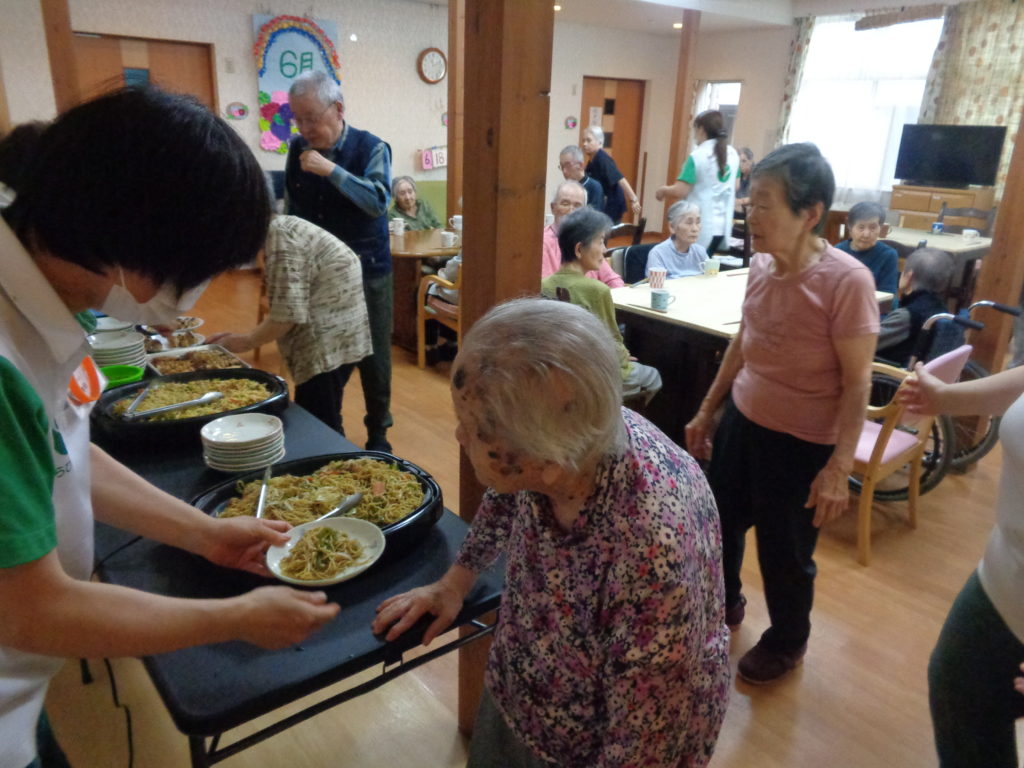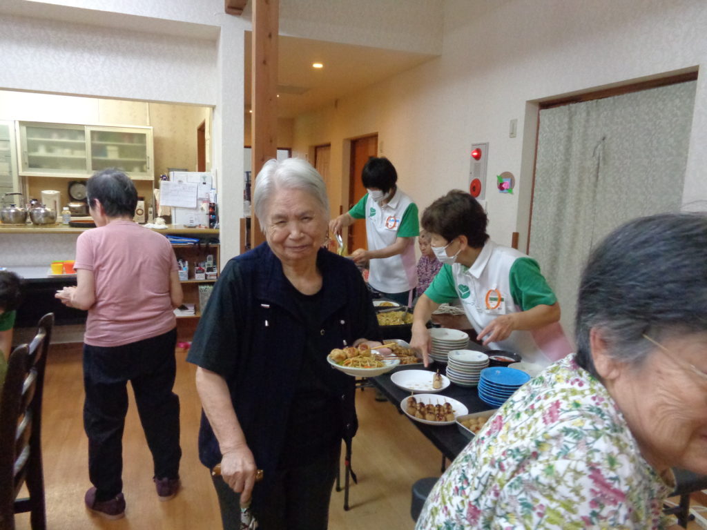 バーベキューの予定で前日から皆さんで準備しましたが、朝からくもりですぐ雨が降ってきたので2Fのリビングでバイキング形式で好きな物を取って食べることになりました。