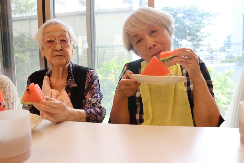 毎年恒例のすいか割大会を開催致しました。この日の為に大きなすいかを4個用意しました。新型コロナウイルス感染症予防の為にフジ2、フジ3各ユニットごとに分かれて行いました。皆様の大声援の中、一人一人順番に割って行きました。目隠し用の眼鏡をしているので、思うように割れませんが全員が力を合わせて見事に割ることが出来ました。すいかは、おやつにお腹いっぱい頂きました。甘くて大変喜ばれました。