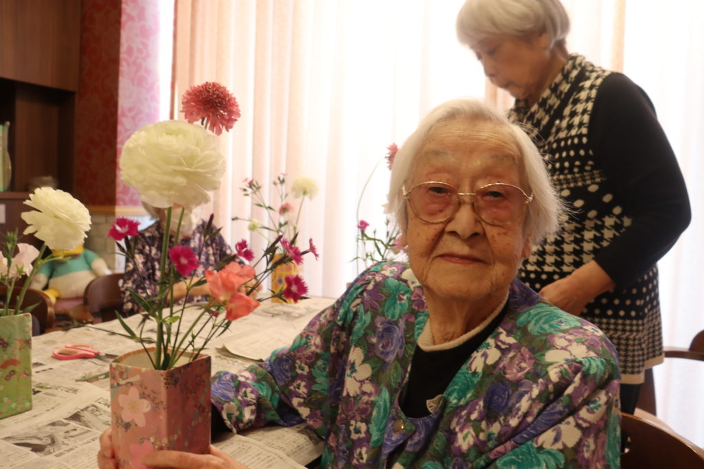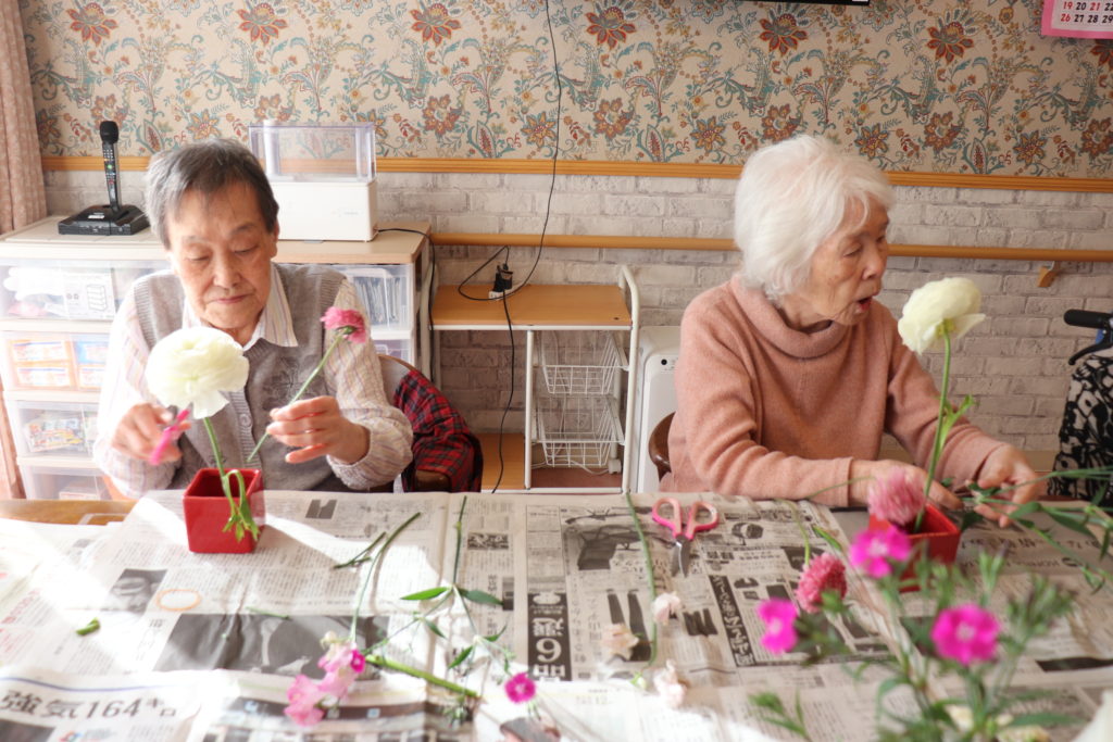 毎月第4水曜日はグループホーム フジでは生け花教室を開催しています。フジ2、フジ3各ユニットリビングで活けて頂いています。当日、地域にあるお花屋さんから季節の花が届きます。入居者様は思い思いに自由に活け、それぞれのお部屋に持ち帰り飾られています。お部屋が華やかになりました。春ですね。(フジ白井)