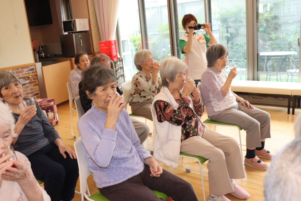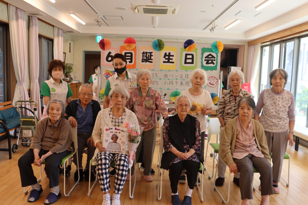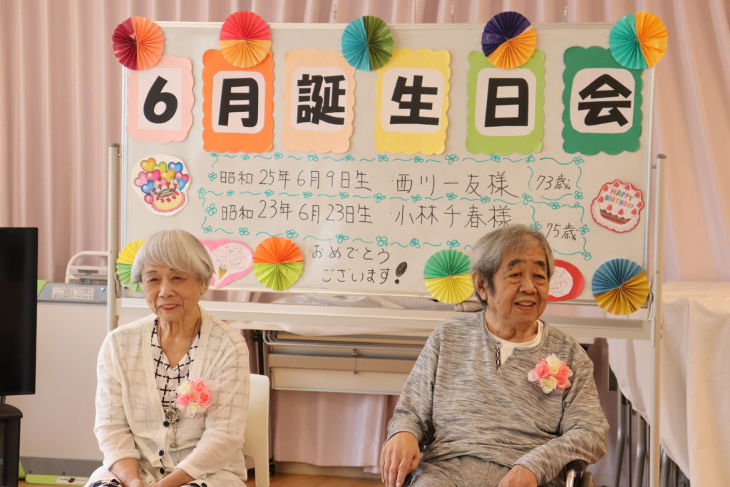 6月の誕生日会を開催致しました。6月は2名の方がお誕生日を迎えられました。お祝いの歌とジュースで乾杯し、手作り色紙のプレゼントを受け取られ、それぞれ挨拶をして頂きました。「素敵な誕生日会をありがとうございます。嬉しく思います。」「これからも皆様と仲良く暮らして行きたいです。」と笑顔で挨拶をされました。お誕生日おめでとうございます。(フジ白井)