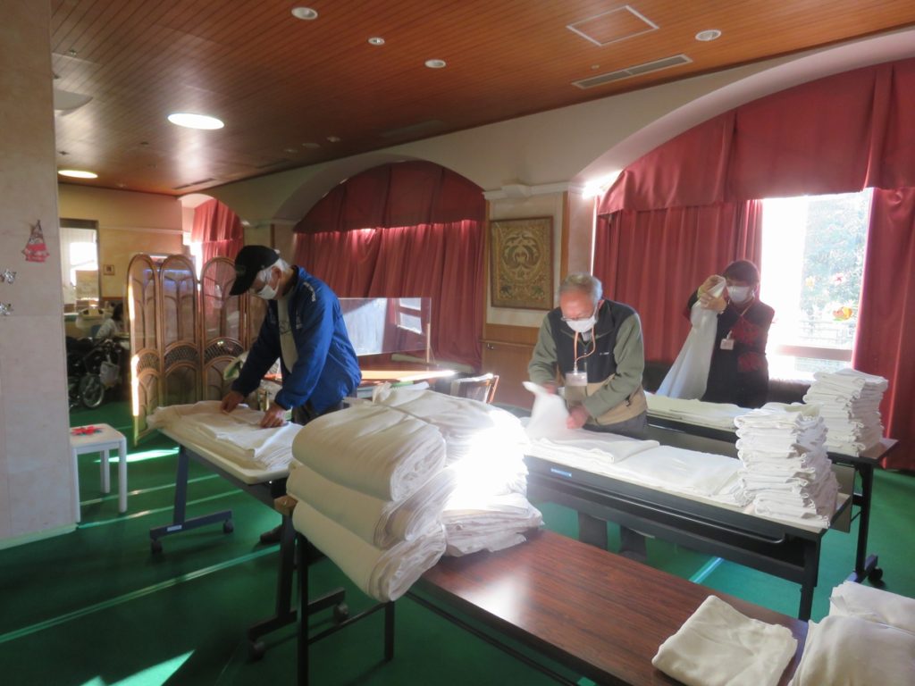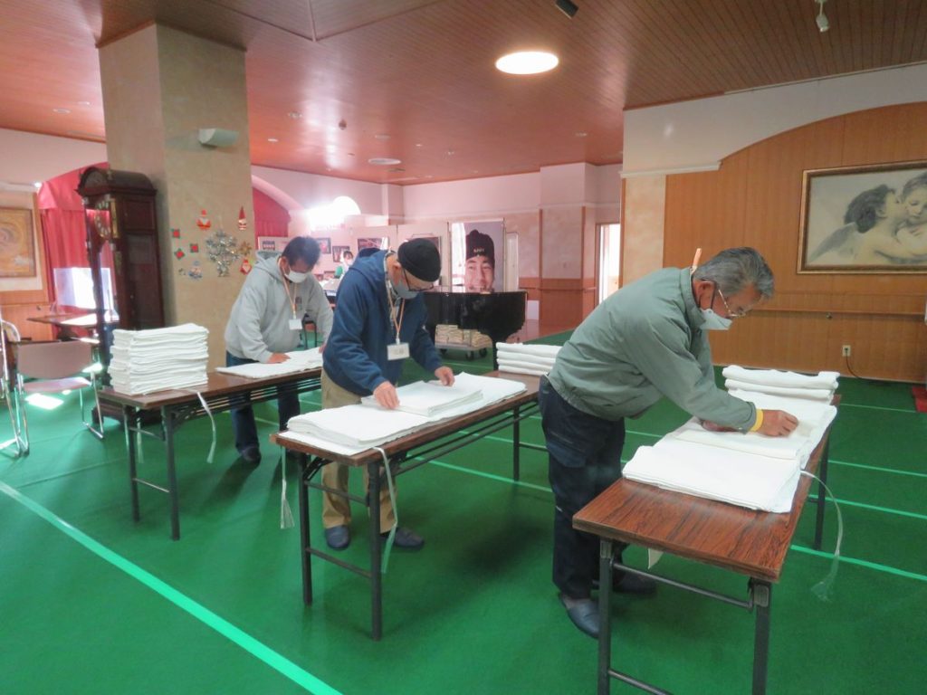 先月に引き続き、第二さわらび荘家族会の皆様が、おむつたたみのボランティア活動を行って下さいました。