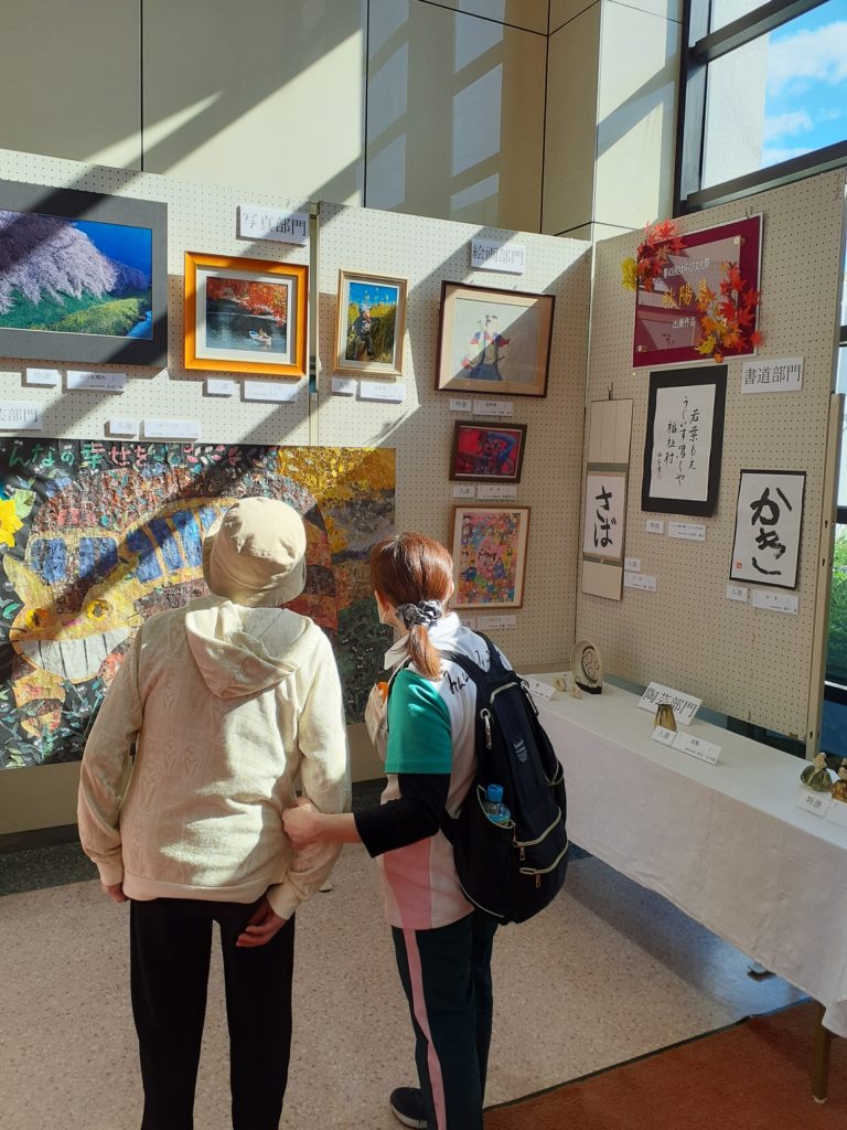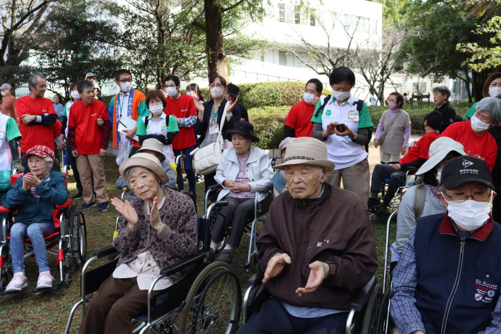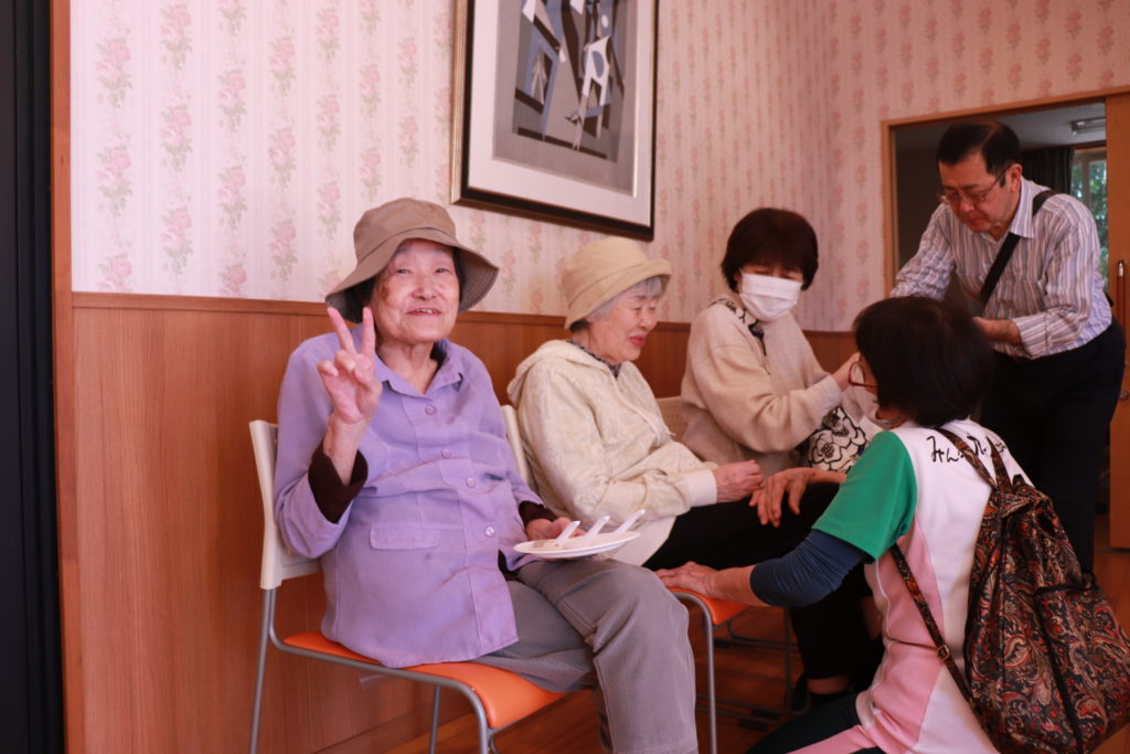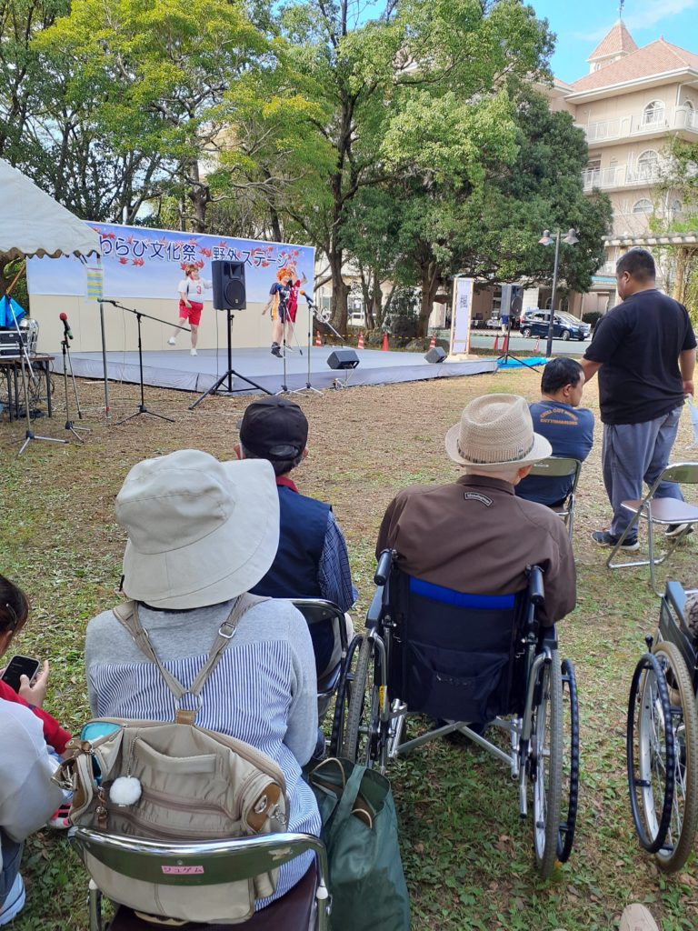 福祉村文化祭に入居者様全員(18名)とご家族様、職員で出かけました。昨日の雨も止み、当日は素晴らしい秋晴れになりました。福祉村に着くと早速、フェリス福祉村で「にぎらな寿司」を頂きました。その後、若菜荘でお抹茶と練りきりを頂き、芝生広場に移動して持参したお弁当も食べました。広場の周辺は、小麦の奴隷(パン屋)、チェロス、キッチンカーも出店されており、食欲の秋を楽しみました。     (フジ白井)
