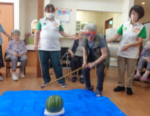 毎年恒例スイカ割りを利用者様一人一回ずつチャレンジいたしました。なかなか割れず