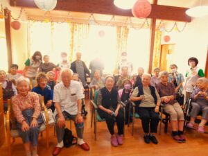 ご家族様、近隣住民の方もご参加いただき大所帯で楽しくちんどん屋さんの演奏を聞かせていただきました。