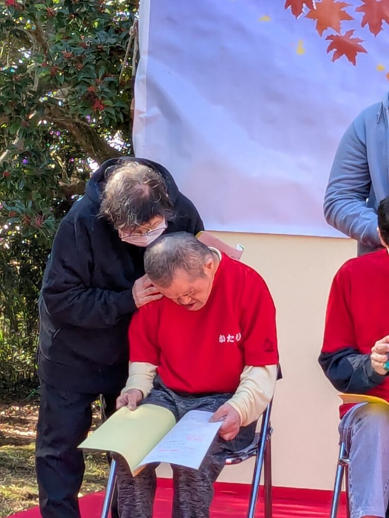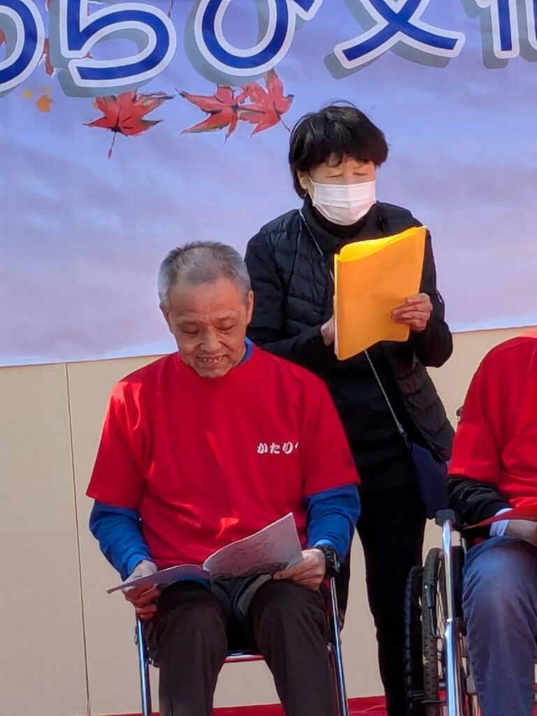 11月3日の午前、文化祭の野外ステージにてかたりべの発表を行いました。今年度は「うさぎとかめ」を題材にアレンジした作品です。4月から文化祭本番の発表に向けて利用者の皆さん一生懸命練習を重ねてきました。練習が進むにつれ声が出るようになり、さらにセリフがスムーズに流れることも増えてきました。皆さん文化祭で発表することがモチベーションとなっており、約半年と短い期間でしたがしっかりと仕上げて本番に挑みました。