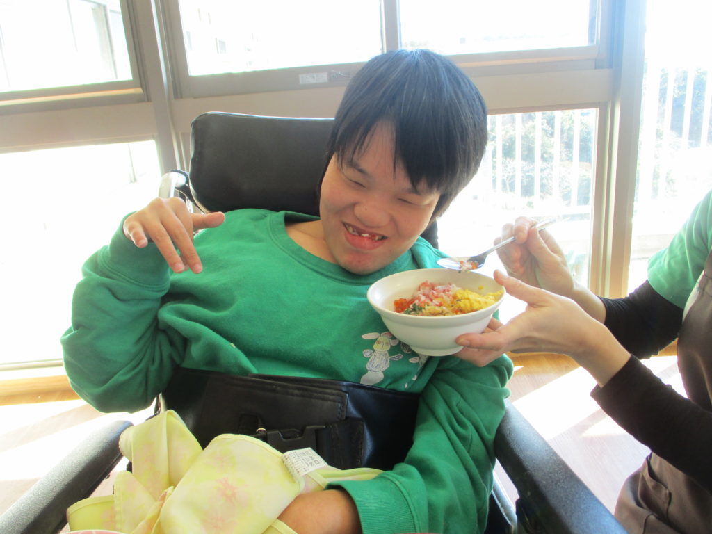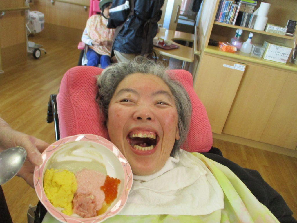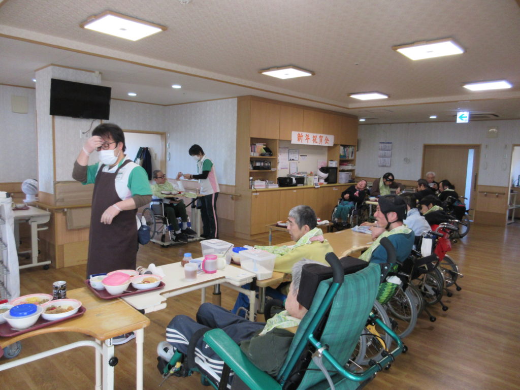 新年祝賀会が行われました。缶ジュースやお酒を持って、乾杯をして新年を迎えられたことをお祝いいたしました。なかなか飲む機会のないお酒にお好きな方もほろ酔いでにっこり。他にもとても豪華な海鮮丼に茶碗蒸しなどが提供され、楽しい時間を過ごされました。