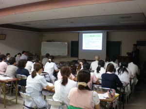 前半は、さわらび会の51年におよぶ歩みとその道筋となる基本理念について、さわらび荘施設長の太田氏による講義です。さわらび会の原点となる山本病院の開院当時の時代背景、またさわらび会が時代を先読みしどのような医療・福祉・サービスを行ってきたのか、その実践そのものがまさにさわらび会の理念の具現化であることを学びました。
