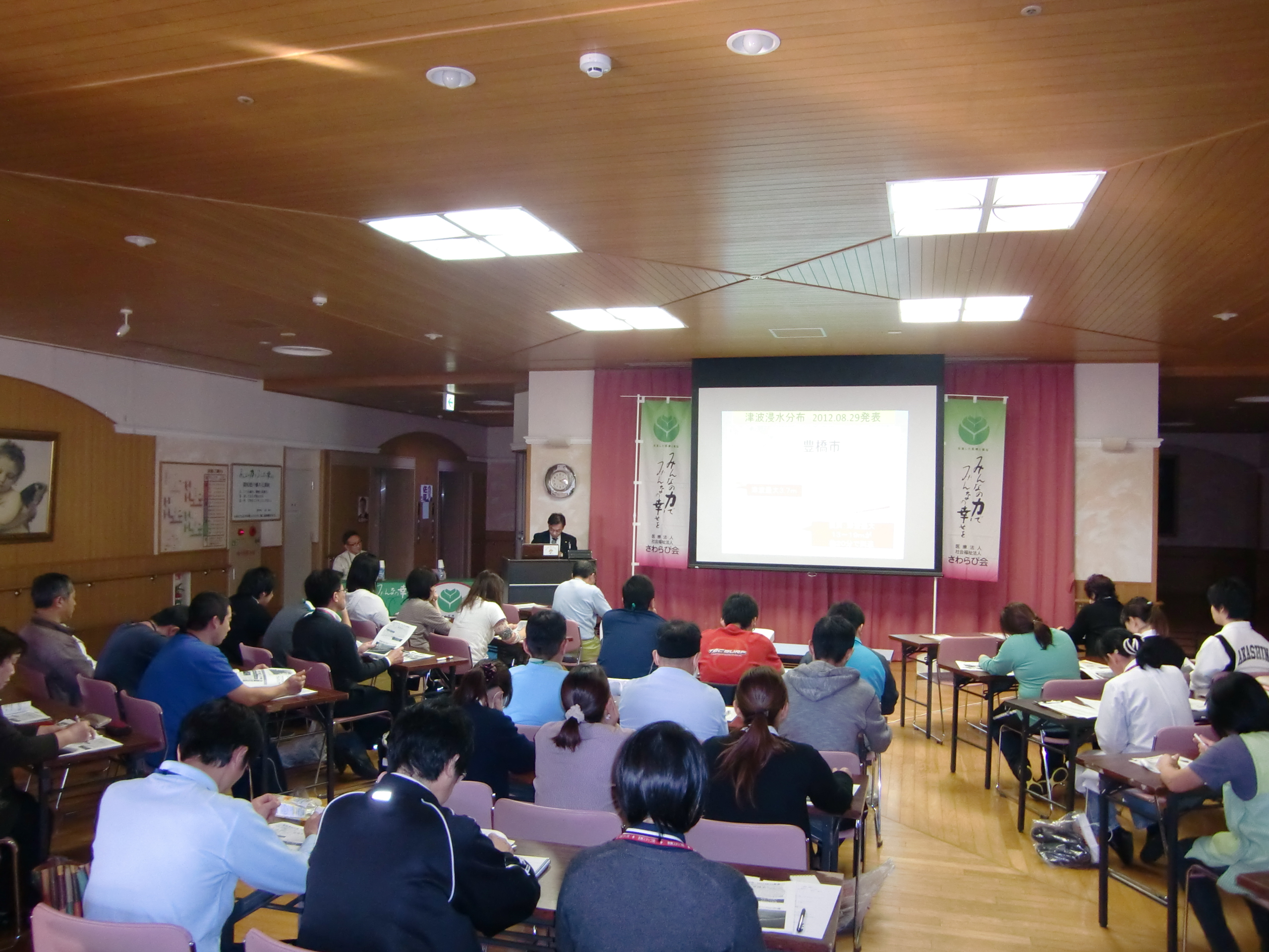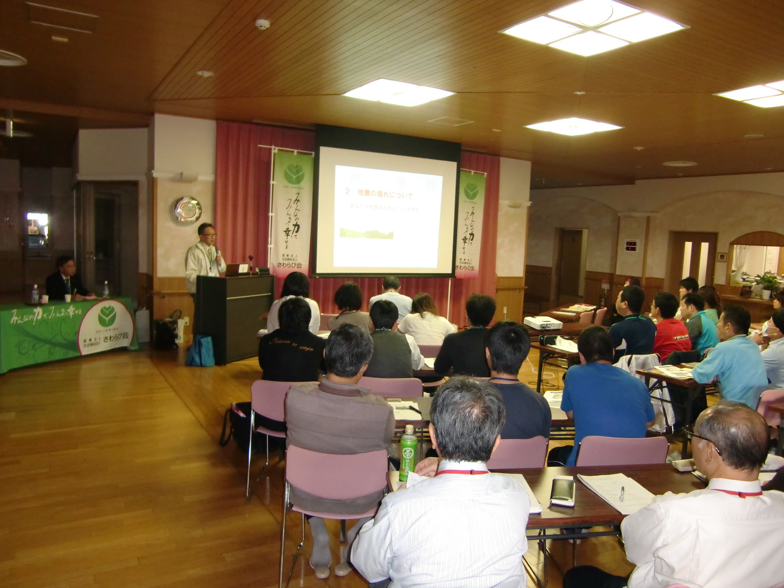 防災についての二段編成の講義に、医療法人さわらび会から10名、社会福祉法人さわらび会から35名の方が参加されました。
